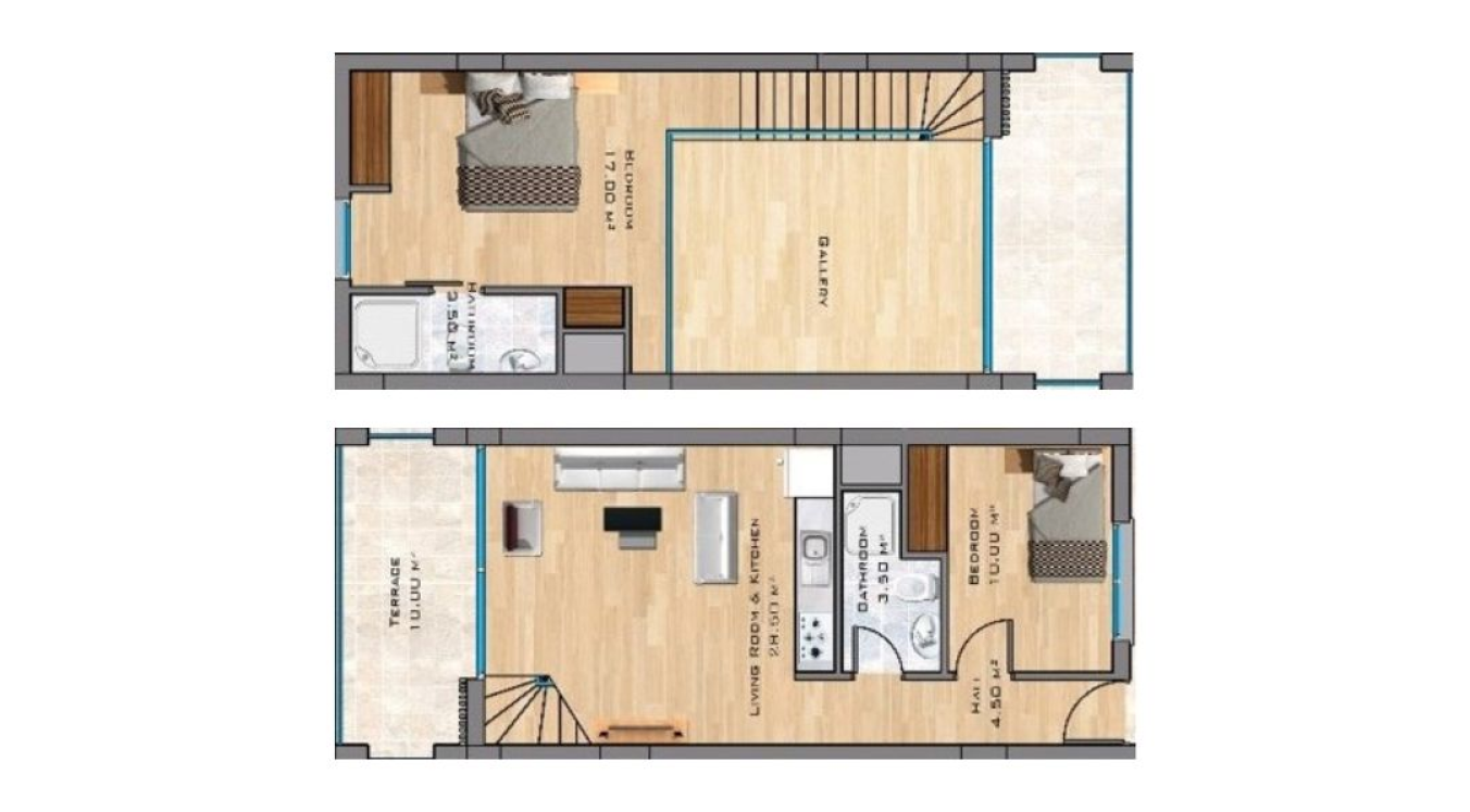 Характеристики объекта- Тип недвижимости: 2+1 Loft Penthouse Площадь: 73 м² (балкон 6м² + терраса на крыше 45м²) Расстояние до моря: 350 м